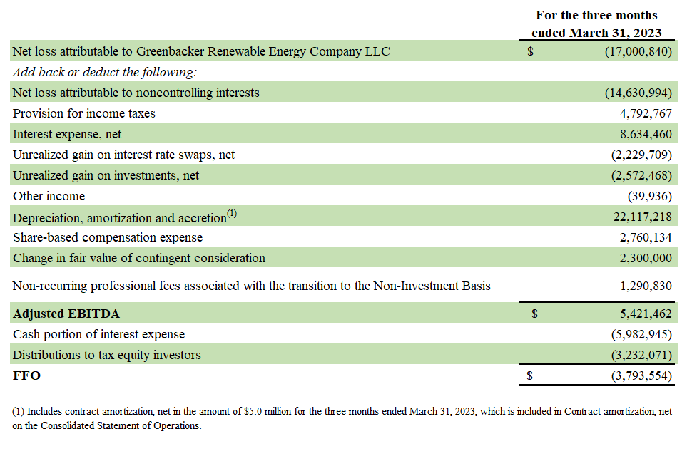 The following table reconciles Net loss attributable to Greenbacker Renewable Energy Company LLC to Adjusted EBITDA and then to FFO:
