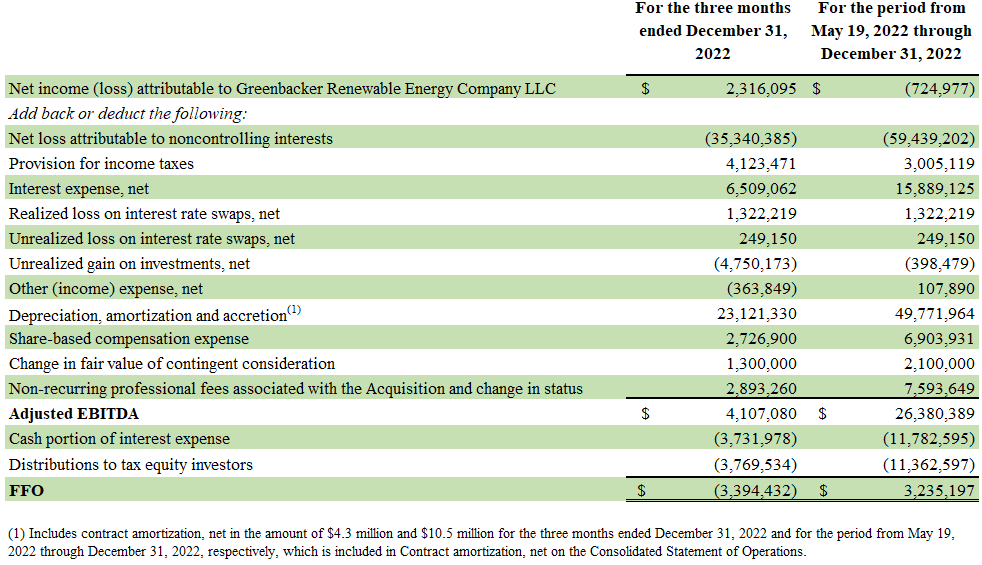 The following table reconciles Net income (loss) attributable to Greenbacker Renewable Energy Company LLC to Adjusted EBITDA and then to FFO: