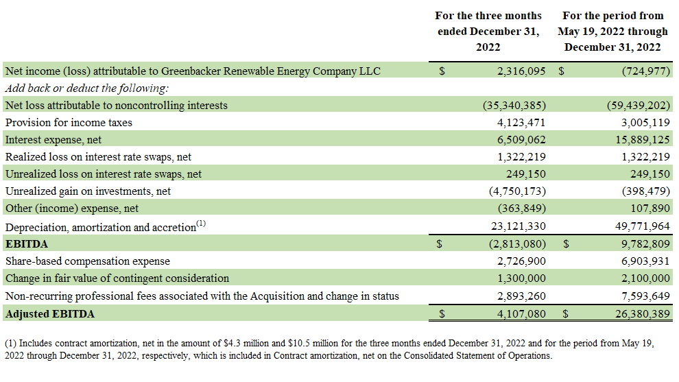 The following table reconciles Net income (loss) attributable to Greenbacker Renewable Energy Company LLC to Adjusted EBITDA: