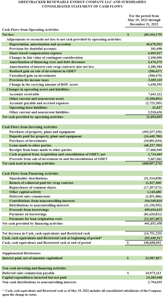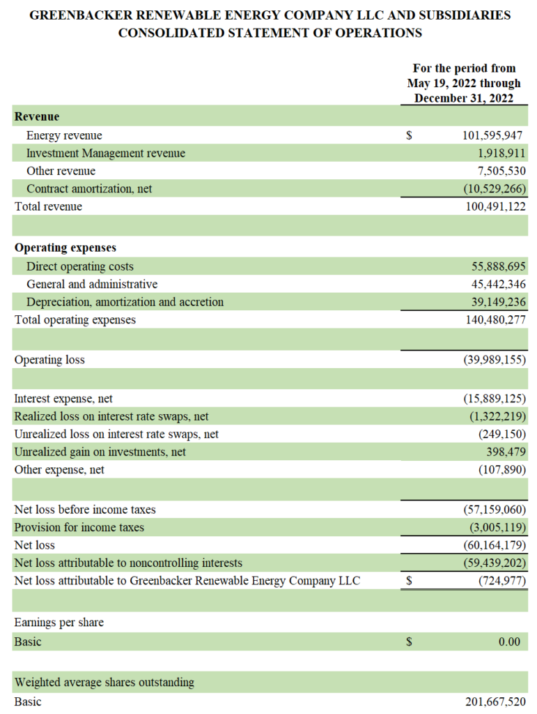 For the period from May 19, 2022 through December 31, 2022In millionsSelect Financial Information Total Revenue$ 100.5Total operating revenue*$ 111.0Net income (loss) attributable to Greenbacker$ (0.7) Adjusted EBITDA†$ 26.4Funds From Operations†$ 3.2NOTE: See the Company’s 2022 10-K filed with the SEC for additional financial information and important related disclosures.